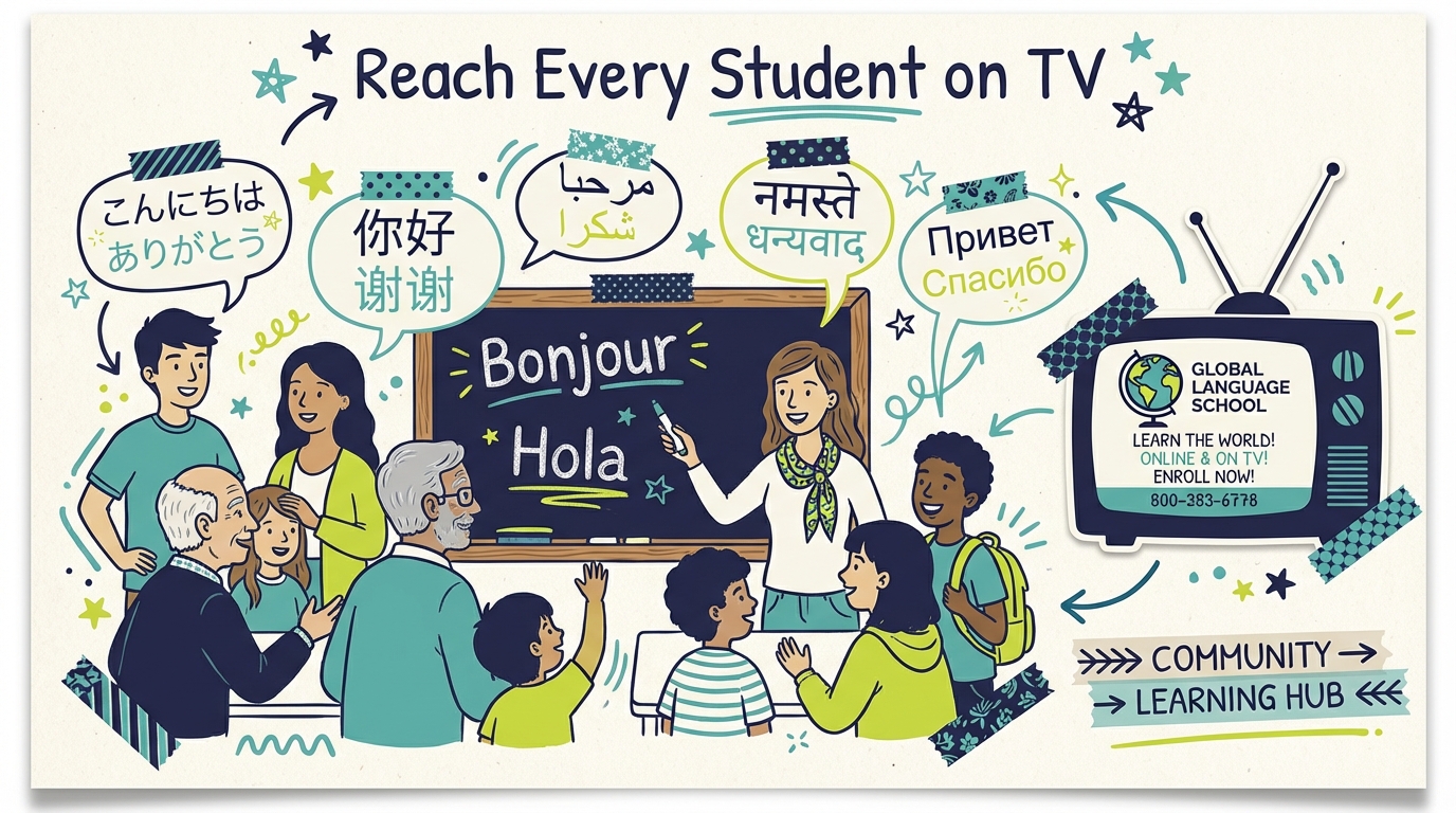 Language is inherently audio-visual. You hear it, you speak it, you watch someone's lips form unfamiliar sounds. That makes TV the ideal medium for language school advertising. A 30-second spot can show a student progressing from hesitant to fluent, an instructor engaging a small class, or a child proudly reading aloud in a new language.