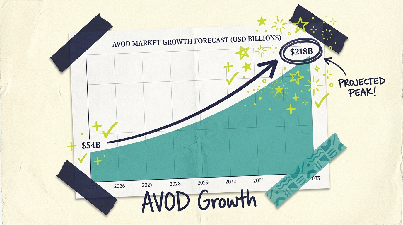 Revenue projections underscore the opportunity. The U.S. AVOD market, valued at $18.52 billion in 2025, is projected to reach $73.42 billion by 2033. Global AVOD is expected to grow from $54.14 billion to $218.31 billion over the same period. These aren't speculative projections about an emerging market. Ad-supported streaming is a massive, established category continuing to expand.