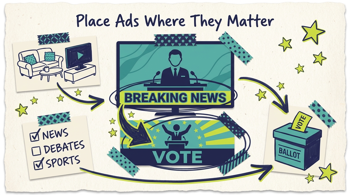 Start with your campaign's top 3-5 message categories: healthcare, economy, public safety, education, immigration, whatever fits your race. For each message, write out 5-10 content types where that message will land naturally. Healthcare might map to health news, medical documentaries, daytime programming, and senior-focused content.
