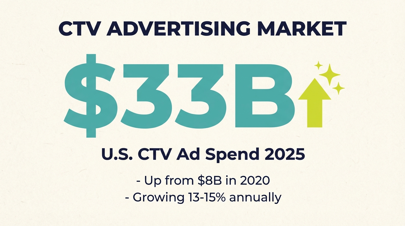 The U.S. connected TV (CTV) advertising market is projected to reach $33.35 billion in 2025, according to eMarketer's latest forecast. This represents roughly four times the market size from just five years ago, when CTV advertising totaled approximately $8 billion in 2020. The explosive growth reflects a fundamental transformation in how Americans watch television and, consequently, how advertisers reach them. For small business owners who have long assumed TV advertising was beyond their reach, this expanding market creates unprecedented opportunities to access premium television inventory at accessible price points.