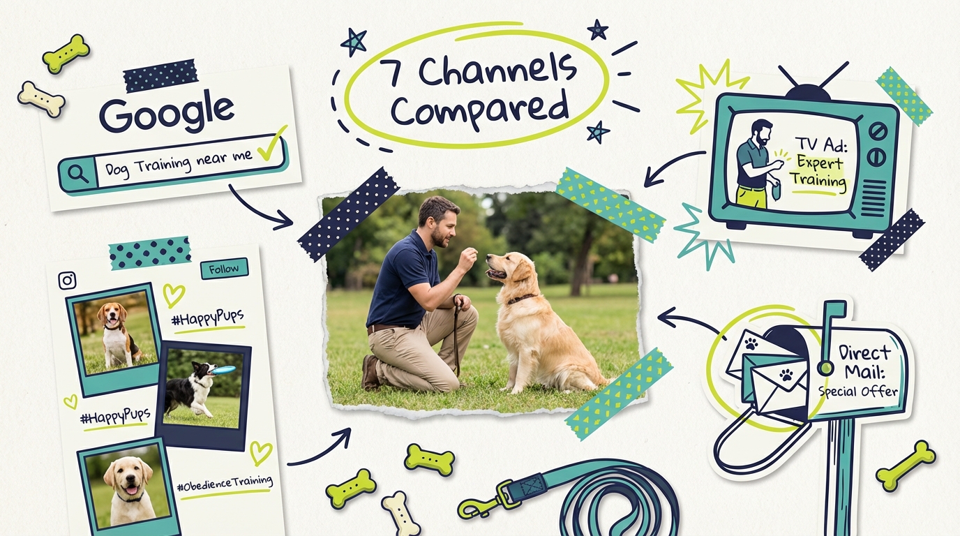 This guide breaks down seven advertising channels that work for dog trainers, compares their costs and strengths, and gives you practical budget frameworks to fill more class slots.