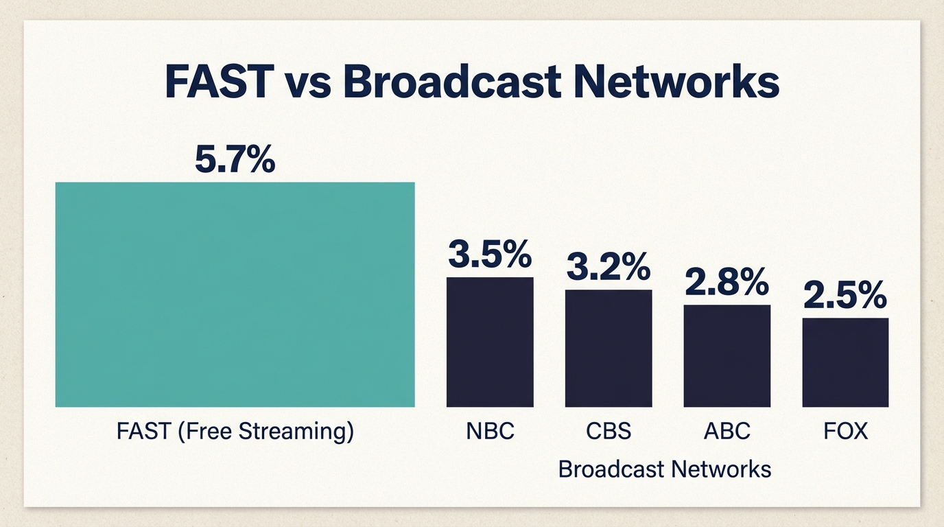 According to Nielsen, free ad-supported streaming services collectively captured 5.7% of total TV viewing in May 2025. While that percentage might seem small in isolation, context reveals its significance. This combined FAST share now exceeds the individual viewing share of any single broadcast network during the same period. In other words, Americans spend more time watching Tubi, Pluto TV, and The Roku Channel combined than they spend watching NBC, CBS, or ABC individually.