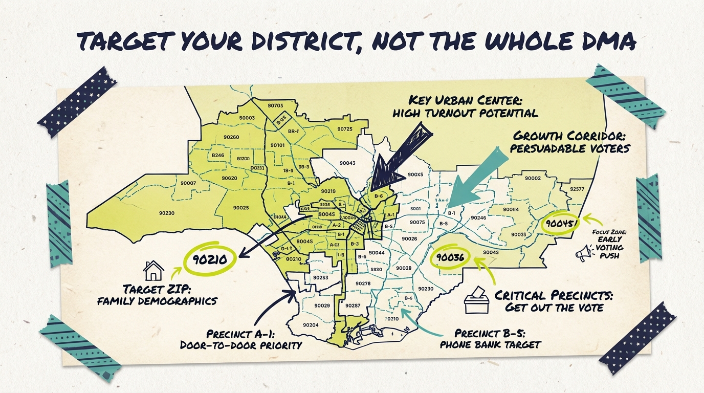 A single DMA might cover a dozen state legislative districts. A congressional district might span parts of three separate DMAs. A city council race might sit inside a DMA that serves 4 million households.