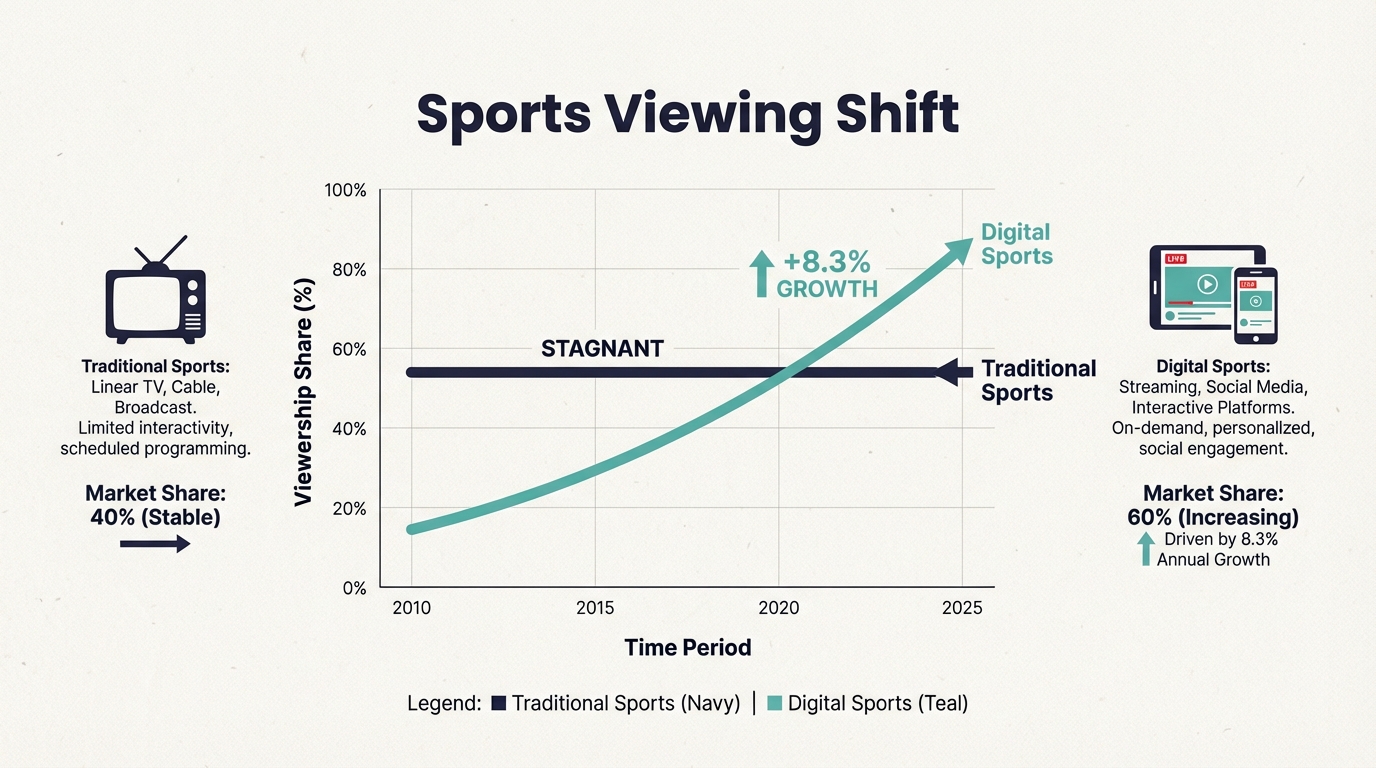The 8.3% year-over-year growth in digital sports viewing compared to just 0.6% growth in total sports viewership reveals that the overall sports audience is not growing significantly. Instead, existing viewers are migrating from traditional broadcast and cable to streaming platforms. This migration has accelerated as major streaming services have invested heavily in sports rights.