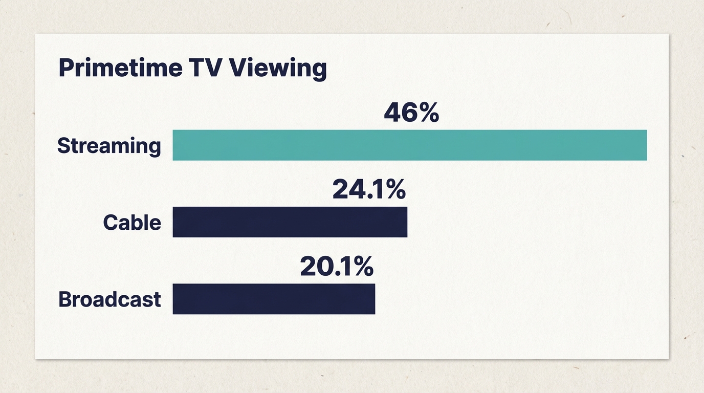 Streaming's primetime dominance represents a permanent structural shift in American television. According to Nielsen, streaming now accounts for 44.8% of all U.S. TV viewing, with the majority happening on ad-supported services.