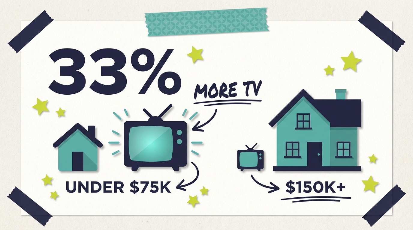 Heavy viewing gap: Under $75K households are 33% more likely to be heavy TV viewers; $150K+ households are 43% less likely (Industry Analysis, 2025)