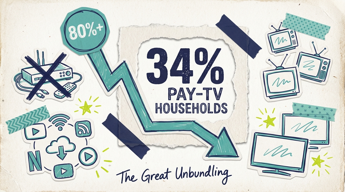 The numbers tell a story of steady erosion. Pay-TV penetration has fallen by more than half in just over a decade, representing one of the most significant shifts in media consumption history.