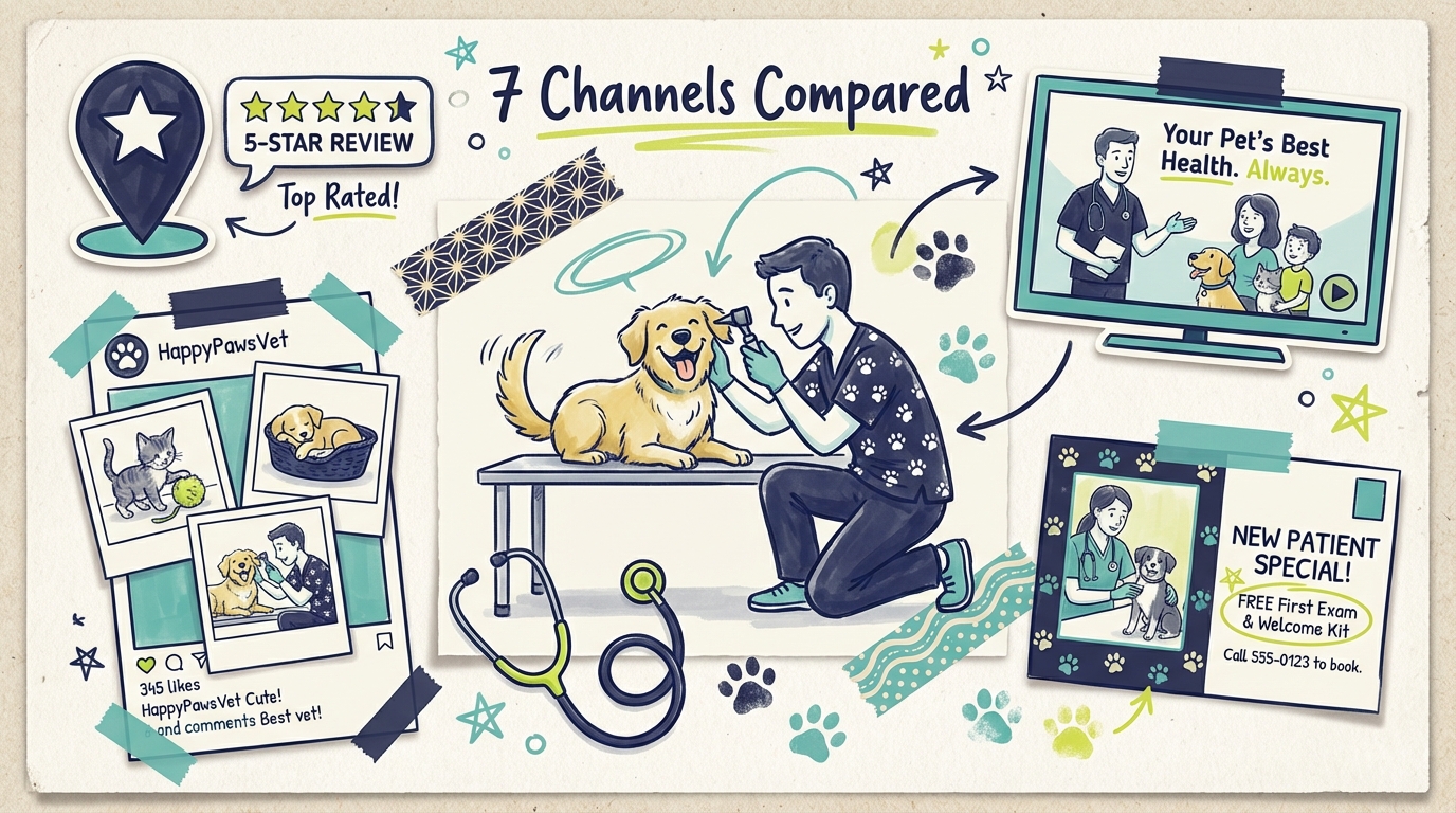 Let's break this down. We'll walk through seven advertising channels that can help your practice attract new pet owners, keep current clients loyal, and compete with the big chains without burning through your budget.
